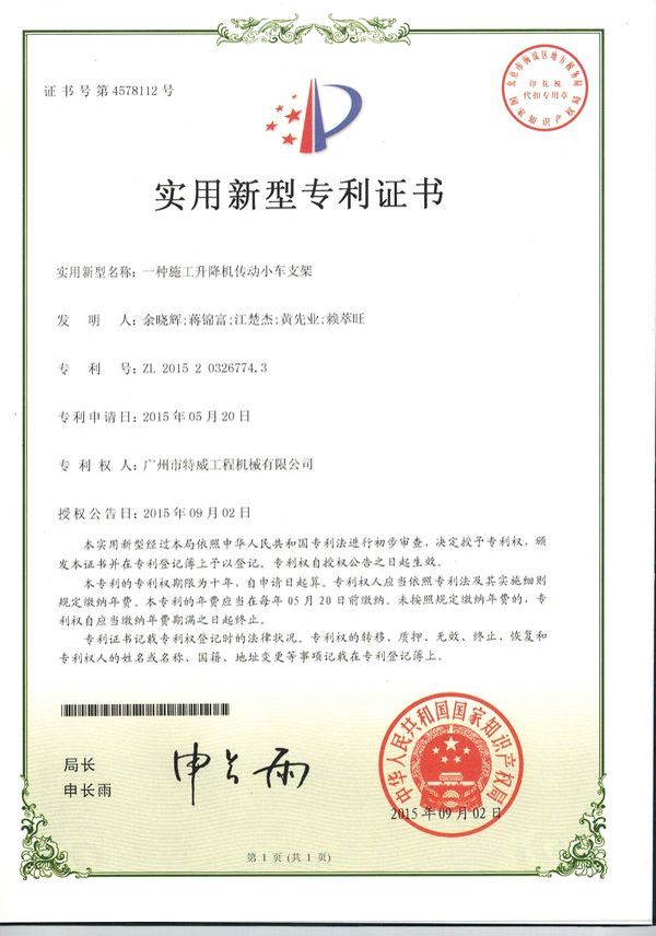 廣州市特威工程機(jī)械有限公司地處廣州市白云區(qū)神山鎮(zhèn),廣清高速神山出口附近,是一家施工升降機(jī)的專業(yè)生產(chǎn)廠家。公司成立于2011年,占地100000多平方米,注冊(cè)資金1060萬(wàn)元,現(xiàn)有員工300余人其中工程技術(shù)人員33人,高級(jí)技術(shù)人員52人。